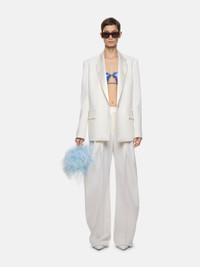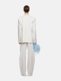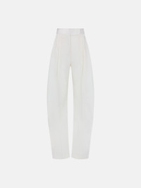 ''Gary'' long pants in milk stretch wool gabardine and duchesse details with high-rise waist and wide leg. Style 232WCP102W041D043 SIZE & FIT The model is wearing a size 40 and her height is 179 cm, bust 80 cm, waist 60 cm, hips 90 cm. Relaxed, oversized fit. We recommend taking one size smaller. DETAILS Main fabric: 98% virgin wool 2% elastane, second fabric: 100% silk, lining: 100% cupro, belt: 100% cotton