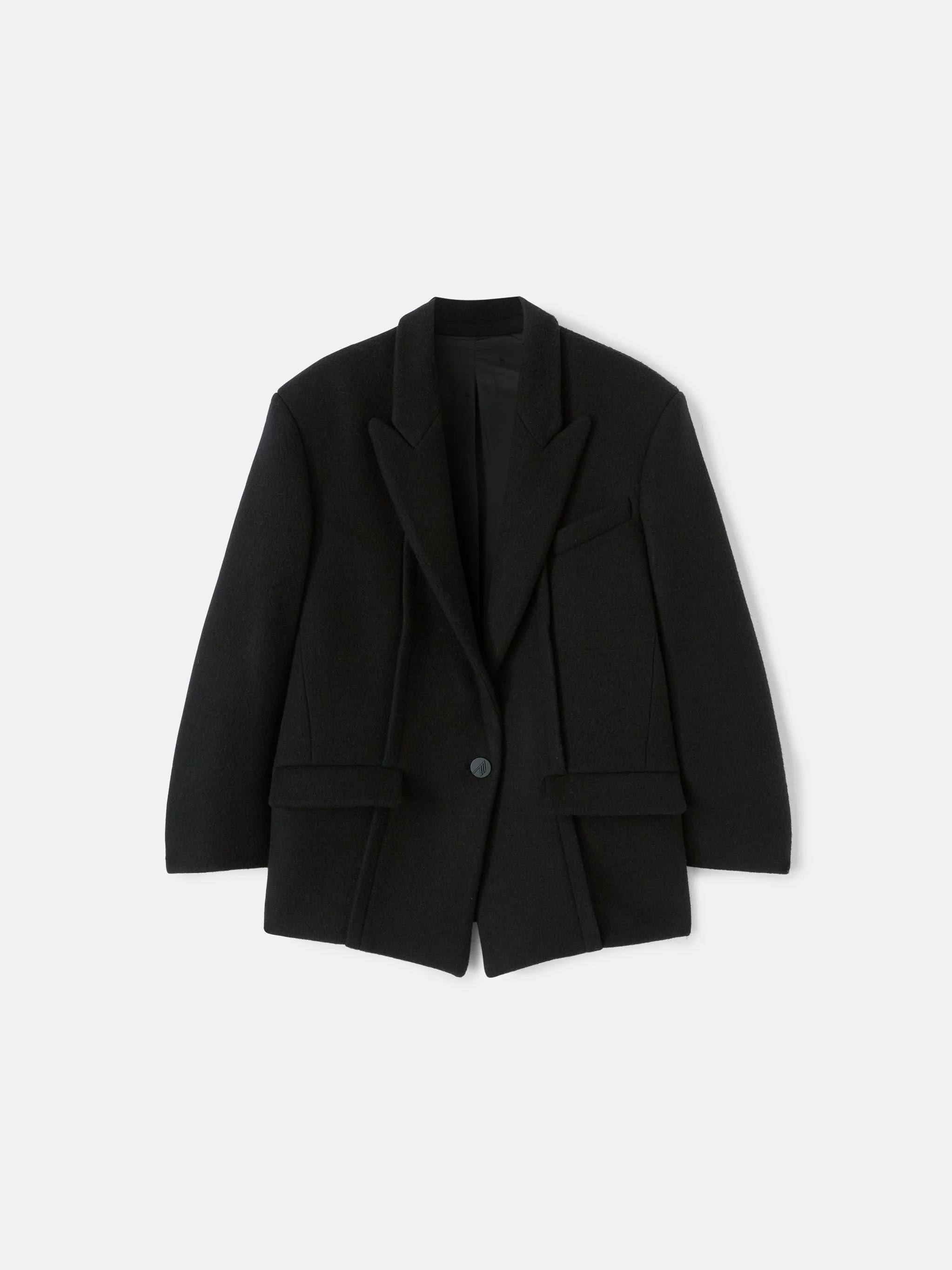 'Glen'' oversize short coat in black wool felt with black jacquard logo lining and black glazed logo button. Made in Italy. Style 237WCB36W043100 SIZE & FIT The model is wearing a size 40 and her height is 70,4 in, bust 30,7 in, waist 21,6 in, hips 34,6 in - height 179 cm, bust 80 cm, waist 60 cm, hips 90 cm. Relaxed, oversized fit. We recommend taking one size smaller. DETAILS Main fabric: 75% virgin wool 25% polyamide, lining: 100% cupro