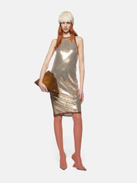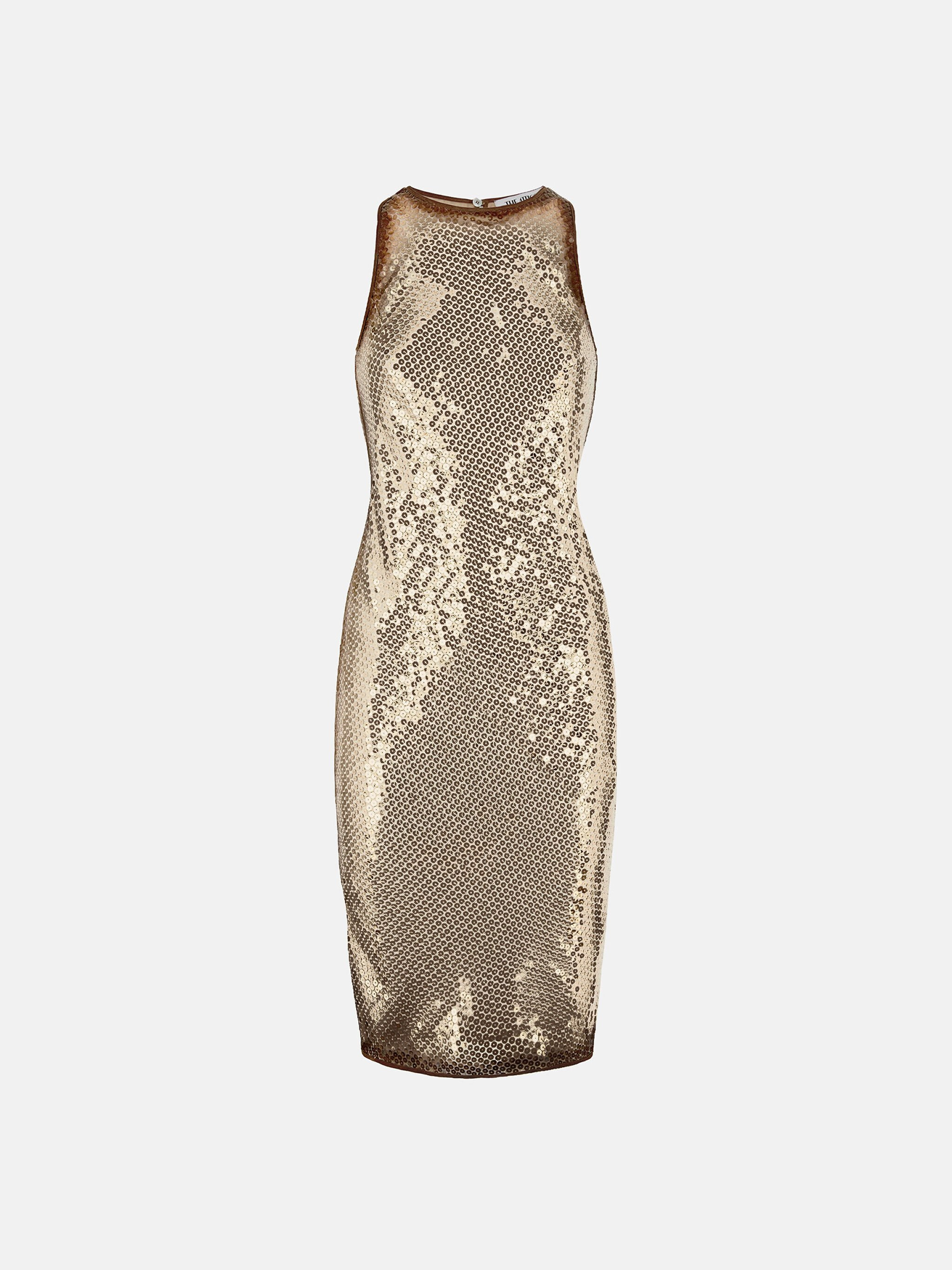 Crew neck a line mini dress in gold sequins. Made in Italy. Style 250WCA00389EEE103SP022 SIZE & FIT The model is wearing a size 40 and her height is 69,6 in, bust 30,7 in, waist 23,2 in, hips 34,6 in - height 177 cm, bust 78 cm, waist 59 cm, hips 88 cm. Regular fit. We recommend taking your true size. DETAILS Main Material: 100% polyester, lining: 100% polyester