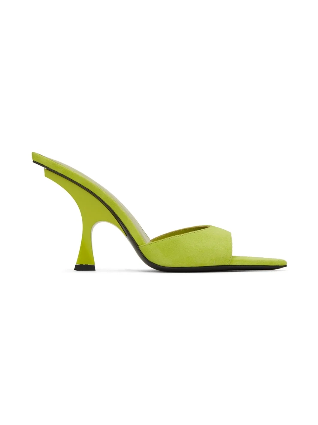Handcrafted suede heeled sandals in green. · Open pointed toe · Logo stamp at padded leather footbed · Modified stiletto heel with rubber injection · Leather sole · Heel: H4" Supplier color: Lime Upper: leather. Sole: leather, rubber. Made in Italy 241528F122004