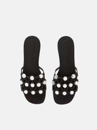 ''Grid'' slide flat in black suede with workmanship. Made in Italy. Style 251WSH00882LBT007SA100 SIZE & FIT Model wears size 39 DETAILS Main leather: 100% goat leather dyed, capra hircus hircus farm raised coo: Africa, second material: 100% acrilonitrile butadiene stirene 100% polymethylmethacrylate, insole and lining: 100% goat leather dyed, capra hircus hircus farm raised coo: India, sole: 100% bovine leather dyed, bos taurus farm raised coo: Europe, heel 05mm.