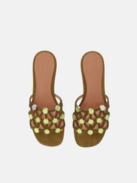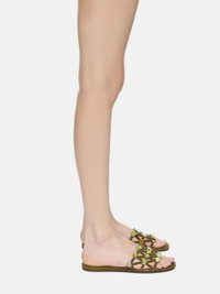 ''Grid'' slide flat in military green suede with workmanship. Made in Italy. Style 251WSH00882LBT007SA828 SIZE & FIT Model wears size 39 DETAILS Main leather: 100% goat leather dyed, capra hircus hircus farm raised coo: Africa, second material: 100% acrilonitrile butadiene stirene 100% polymethylmethacrylate, insole and lining: 100% goat leather dyed, capra hircus hircus farm raised coo: India, sole: 100% bovine leather dyed, bos taurus farm raised coo: Europe, heel 05mm.