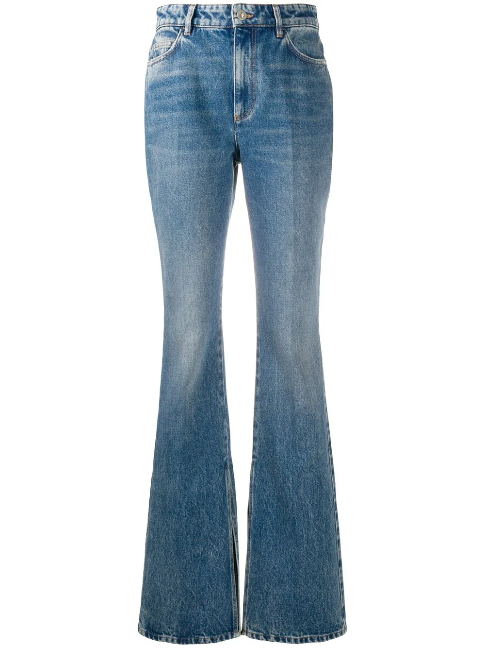 high-waisted bootcut jeans Highlights - Dark blue - Cotton - High waist - Belt loops - Front button and zip fastening - Classic five pockets - Bootcut Made in Italy Composition Cotton 100% SIZE & FIT Model measurements Height 5 ft 10 in(1.78 m) Bust/Chest 31.49 in(80 cm) Hips 36.22 in(92 cm) Waist 25.59 in(65 cm) FittingInformation This piece fits true to size. We recommend you get your regular size Designed to be fitted at the waist and through the thigh, loose from the knee Made with a mid-weight non-stretch fabric Washing instructions Machine Wash