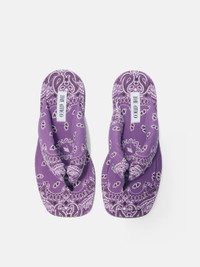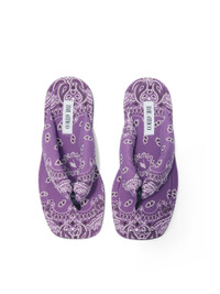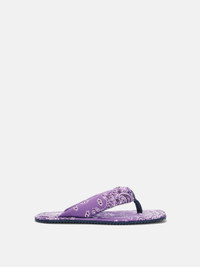 "Indie" flat thong in bandana printed lycra violet, brown and white. Made in Italy. Style 243WS797PA48P690 SIZE & FIT Model wears size 39 DETAILS Main fabric: 80% polyamide 20% elastane, insole: 100% goat leather dyed, capra hircus farm raised coo: India, sole: 100% thermoplastic polyurethane, heel flat