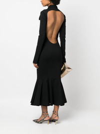 Isabel open-back midi dress This structured dress by The Attico is decorated with an elegant tie detail at the neck. Designed with a form-flattering silhouette, it glides over the body to a ruffled peplum hem that adds drama. Highlights - Black - High neck - Knot detailing - Cut-out detailing - Long sleeves - Concealed side zip fastening - Fitted waistline - Open back - Peplum hem - Ruffle hem Made in Italy Composition Outer: Rayon 68%, Polyamide 27%, Spandex/Elastane 5% Lining: Polyamide 73%, Spandex/Elastane 27% SIZE & FIT Model measurements Height 5 ft 10 in(1.78 m) Bust/Chest 32.67 in(83 cm) Hips 35.43 in(90 cm) Waist 23.22 in(59 cm) Washing instructions Machine Wash