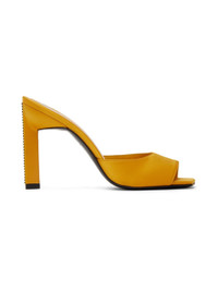 Satin heeled sandals in yellow. · Open square toe · Logo printed at padded footbed · Crystal-cut appliques at stiletto heel · Leather sole with rubber injection at heel · Heel: H4 in Supplier color: Pumpkin Upper: textile. Sole: leather. Made in Italy 231528F125013