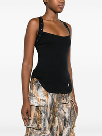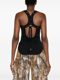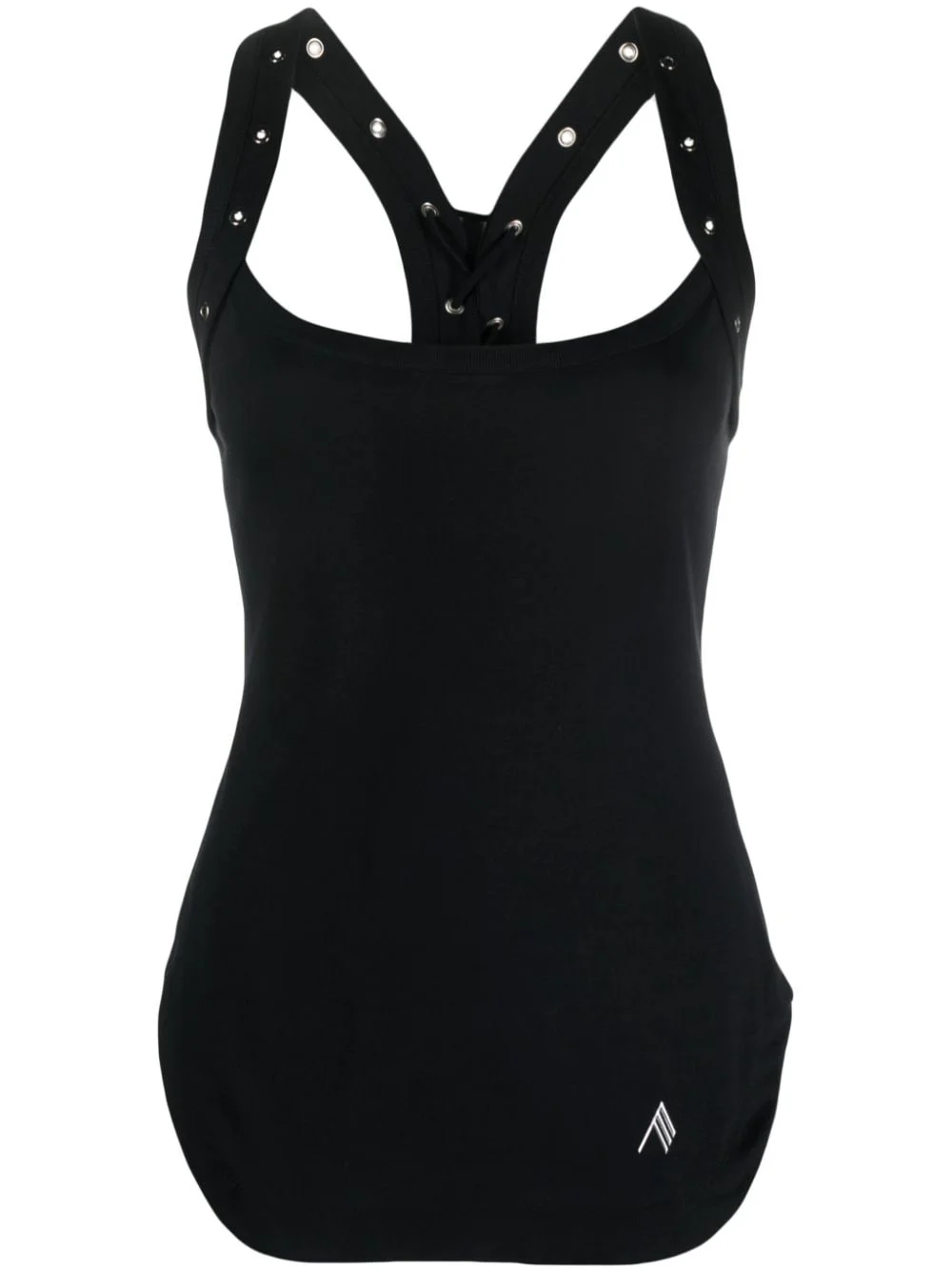 lace-up racerback tank top The Attico's affinity for offbeat silhouettes and adjustable detailing is evidenced by this black tank top. While the front looks simple, the back tells another story: its circular cut-out is framed by eyelet-embellished straps threaded with elongated self-ties. Highlights - Black - Cotton - Metal eyelet detailing - Metallic applique logo - U-neck - Halterneck tie fastening - Curved hem Imported Composition Cotton 100% SIZE & FIT Model measurements Height 5 ft 9 in(1.76 m) Bust/Chest 33.07 in(84 cm) Hips 38.58 in(98 cm) Waist 24.8 in(63 cm) FittingInformation Designed for a slim fit that sits just away from the body offering a close yet comfortable fit The adjustable drawstring means that you can adjust this piece’s fit to suit your comfort and preference Made from a midweight non-stretch fabric, this piece offers minimal elasticity when worn This piece fits true to size – take your usual size Washing instructions Machine Wash