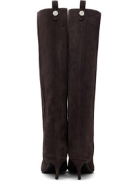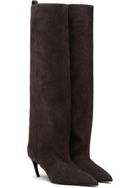 Knee-high goatskin suede boots. · Pointed toe · Pull-loop and logo hardware at heel collar · Covered curved heel with rubber injection · Leather sole · Heel: H2.75" Supplier color: Dark brown Upper: goatskin. Sole: leather. Made in Italy 261528F115003