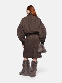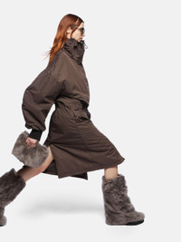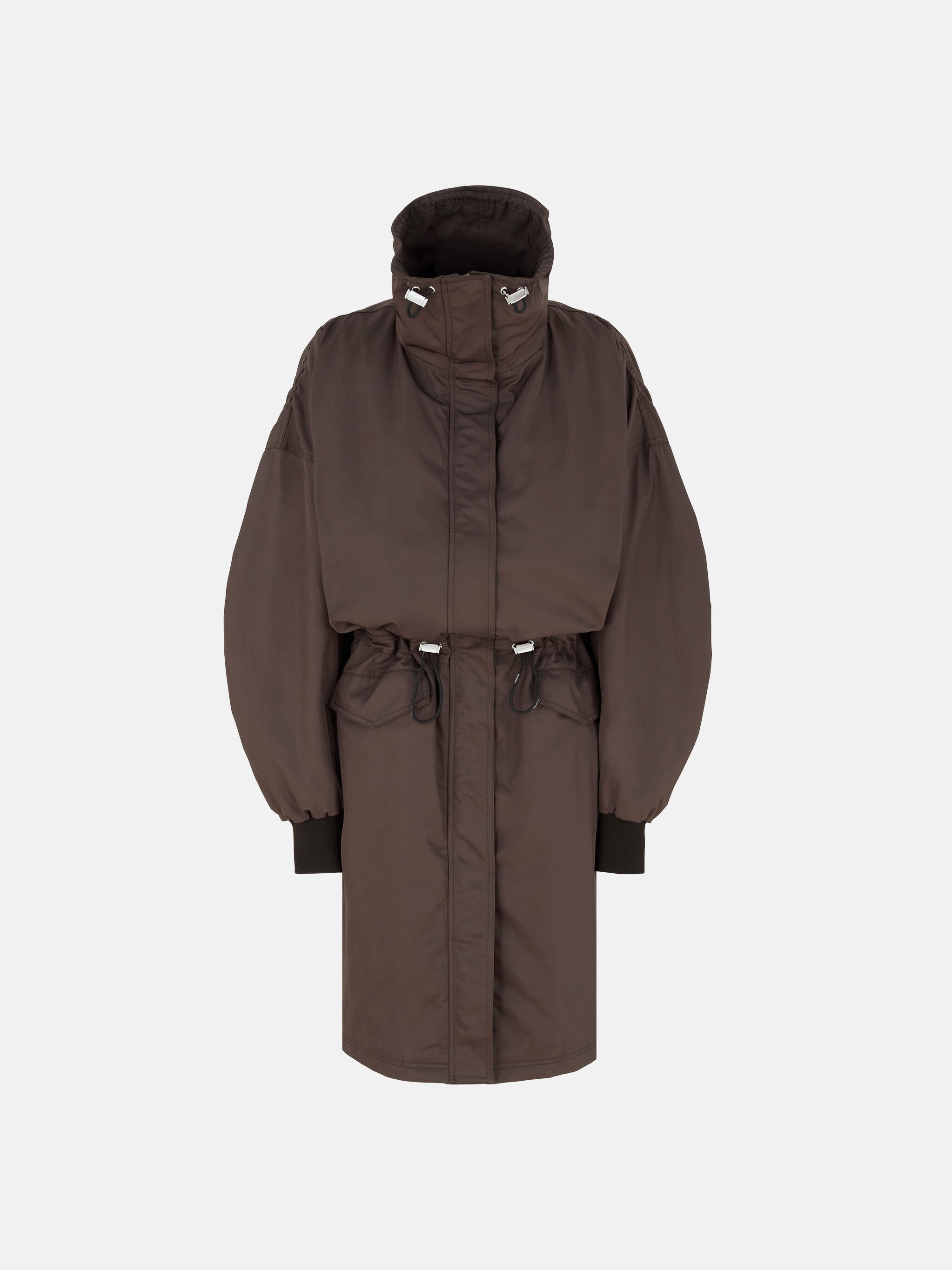 Oversize long windbreaker in brown nylon with drawstring on the waist. Made in Italy. Style 250WCC00083PLL001AA064 SIZE & FIT The model is wearing a size 40 and her height is 69,6 in, bust 30,7 in, waist 23,2 in, hips 34,6 in - height 177 cm, bust 78 cm, waist 59 cm, hips 88 cm. Regular fit. We recommend taking your true size. DETAILS Main Material: 100% polyester, lining: 100% polyester, wadding: 100% polyester, rib: 100% polyamide