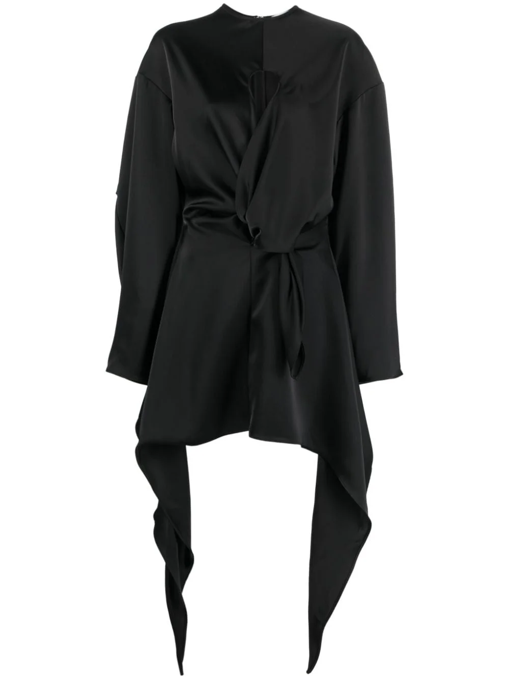 asymmetric cut-out satin minidress The Attico adds an alluring twist to the shirting silhouette of this black satin dress in the form of a covert teardrop cut-out at the decolletage. The twisted tied front creates elegant drape through the bodice to mimic the waterfall hem. Highlights - Black - Satin finish - Wrap design - Twist detailing - Cut-out detailing - Draped detailing - Round neck - Long sleeves - Asymmetric hem Made in Italy Composition Polyester 100% SIZE & FIT Model measurements Height 5 ft 10 in(1.77 m) Bust/Chest 27.95 in(71 cm) Hips 33.85 in(86 cm) Waist 23.22 in(59 cm) Measurement SLEEVE LENGTH 18.89 in(48 cm) LENGTH 31.88 in(81 cm) BUST 36.22 in(92 cm) FittingInformation Designed for a slim fit that sits just away from the body offering a close yet comfortable fit Made from a midweight non-stretch fabric This piece fits true to size – take your usual size