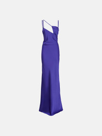 'Melva'' long dress in vivid violet double satin with asymmetrical neckline and logo metal ring. Made in Italy. Style 236WCW69E020493 SIZE & FIT The model is wearing a size 40 and her height is 70,4 in, bust 30,7 in, waist 21,6 in, hips 34,6 in - height 179 cm, bust 80 cm, waist 60 cm, hips 90 cm. Fitted style. We recommend taking one size larger. DETAILS Main fabric: 100% polyester, lining: 100% polyester