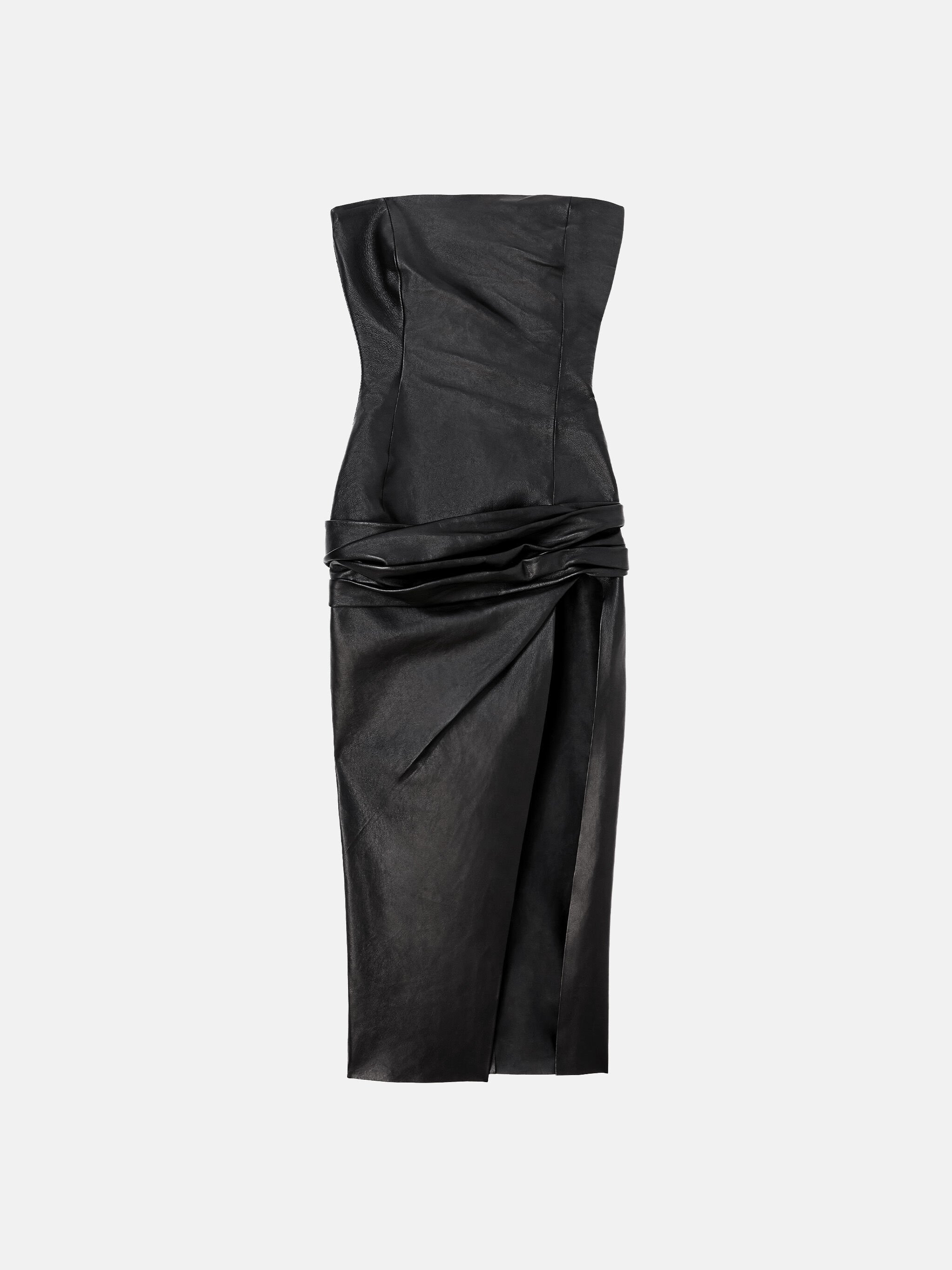 Midi dress strapless in black leather draped on the waist. Made in Romania. Style 250WCW00215LBT128AA100 SIZE & FIT The model is wearing a size 40 and her height is 69,6 in, bust 30,7 in, waist 23,2 in, hips 34,6 in - height 177 cm, bust 78 cm, waist 59 cm, hips 88 cm. Regular fit. We recommend taking your true size. DETAILS Main Material: Main Material: 100% Lamb Leather Ovis Aries Aries, farm raised,coo: Tunisia, lining: 100% cotton