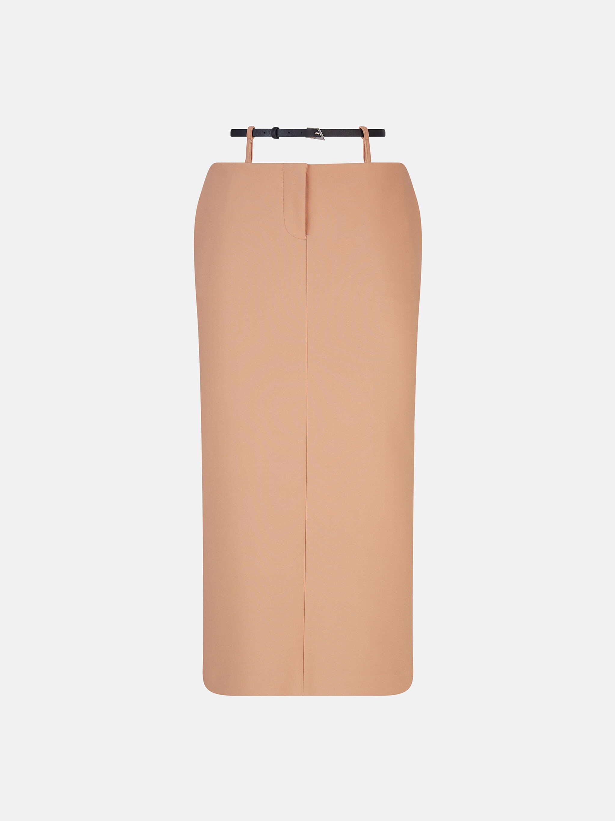 Midi skirt in pink sand crepe stretch with loops, leather belt and metal branded buckle. Made in Italy. Style 248WCS225E100004 SIZE & FIT The model is wearing a size 40 and her height is 69,6 in, bust 30,7 in, waist 23,2 in, hips 34,6 in - height 177 cm, bust 78 cm, waist 59 cm, hips 88 cm. Regular fit. We recommend taking your true size. DETAILS Main material: 90% polyester 10% elastane, lining: 100% viscose