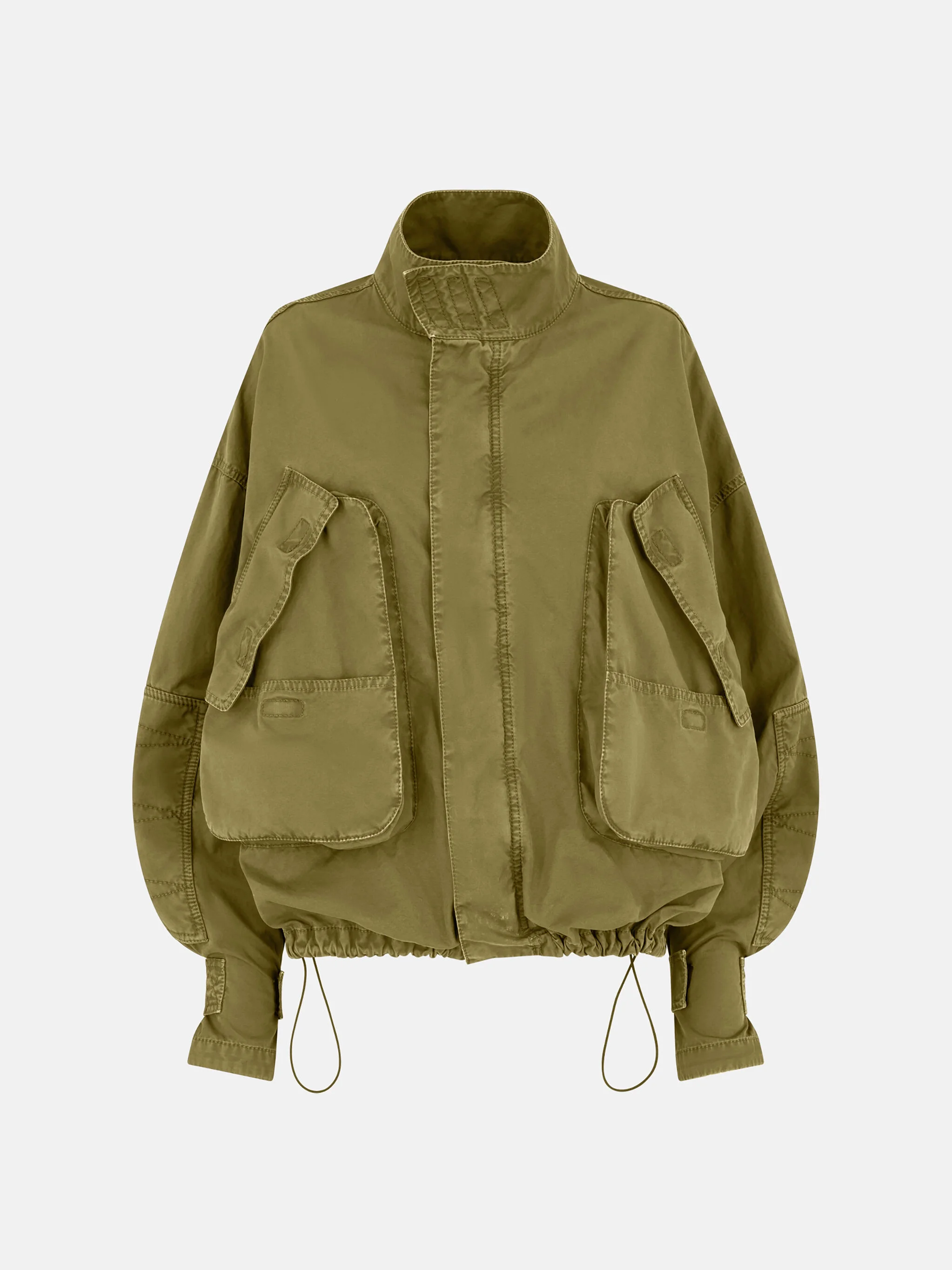 Bomber in military green overdyed canvas. Made in Romania. Style 260WCB00103CCC123OD081 SIZE & FIT The model is wearing a size 40 and her height is 179 cm, bust 80 cm, waist 60 cm, hips 88 cm - Height 5,10 in, bust 31,4 in, waist 23 in, hips 35 in. Regular fit. We recommend taking your true size. DETAILS Main material: 100% cotton, embroidery: 100% calf leather, bos taurus farm raised coo: Europe
