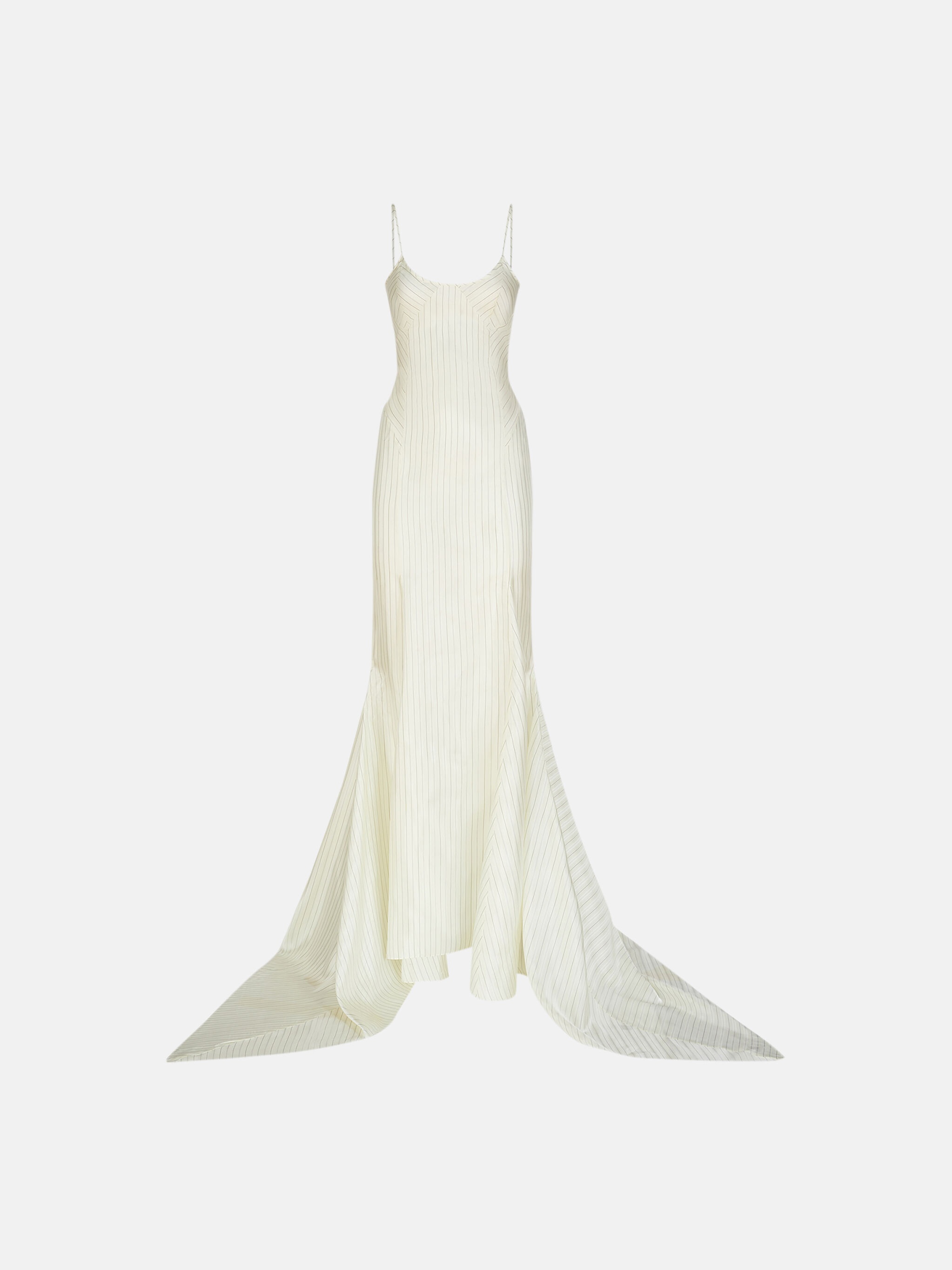 Long dress in milk striped lining with thiny straps, wide bottom and logo metal ring. Style 241WCW97VL03L043 SIZE & FIT The model is wearing a size 40 and her height is 177 cm, bust 80 cm, waist 60 cm, hips 88 cm. Regular fit. We recommend taking your true size. DETAILS Main fabric: 53% acetate 47% viscose