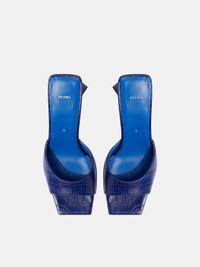 'Mini Devon'' in electric blue crocodile printed leather, pyramid heel, height 85mm. Made in Italy. Style 241WS772EL002034 SIZE & FIT Model wears size 39. DETAILS Main leather: 100% calf bos taurus farm raised coo: Uganda, insole and lining: 100% goat leather dyed, capra hircus hircus farm raised coo: India, sole: 100% bovine leather dyed, bos taurus farm raised coo: Western Europe, heel 85mm
