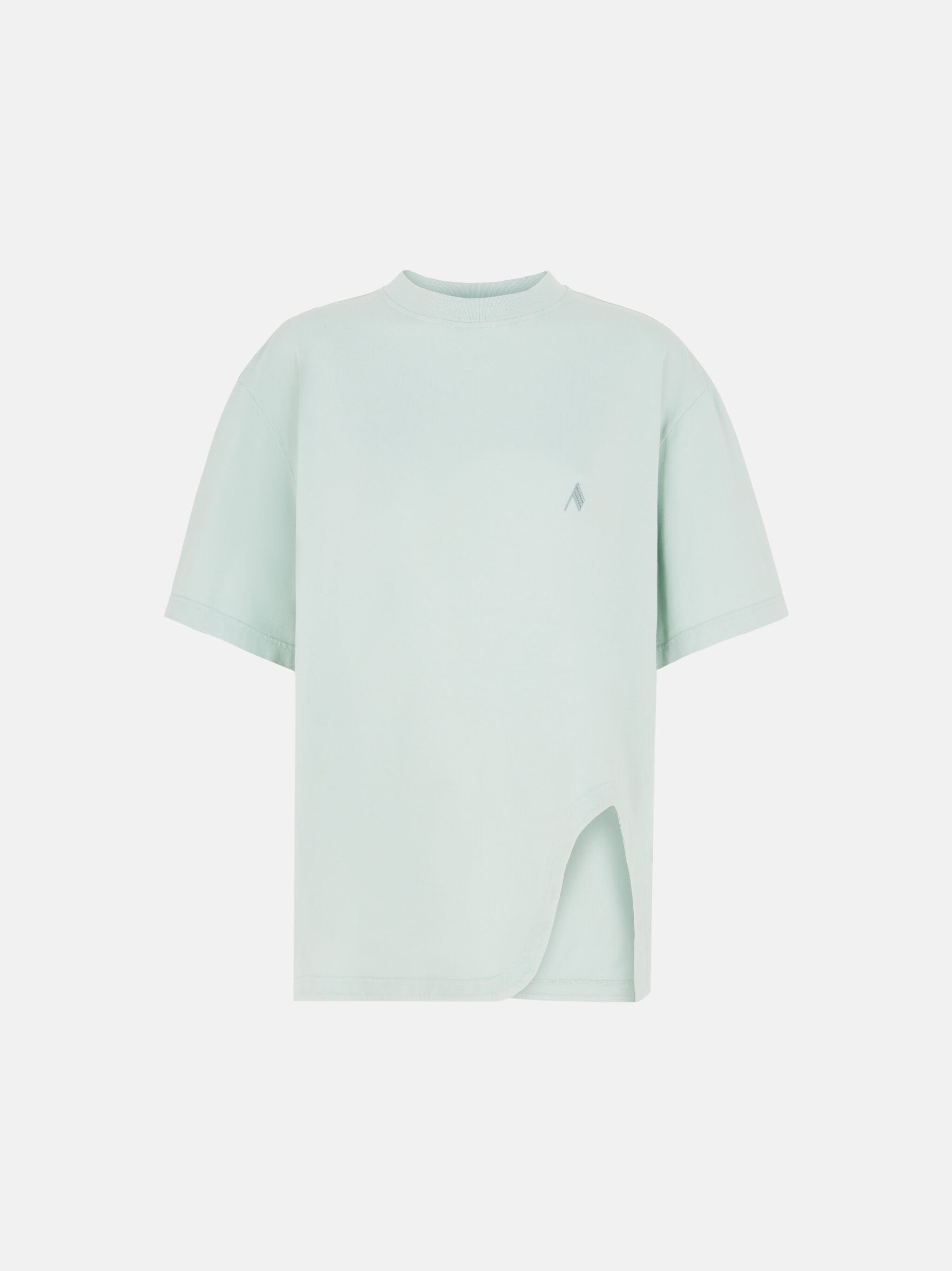 Oversize t-shirt in mint light jersey with shaped split. Made in Italy. Style 250WCT00350JJJ025AA016 SIZE & FIT The model is wearing a size 40 and her height is 69,6 in, bust 30,7 in, waist 23,2 in, hips 34,6 in - height 177 cm, bust 78 cm, waist 59 cm, hips 88 cm. Regular fit. We recommend taking your true size. DETAILS Main Material: 100% cotton, rib: 100% cotton