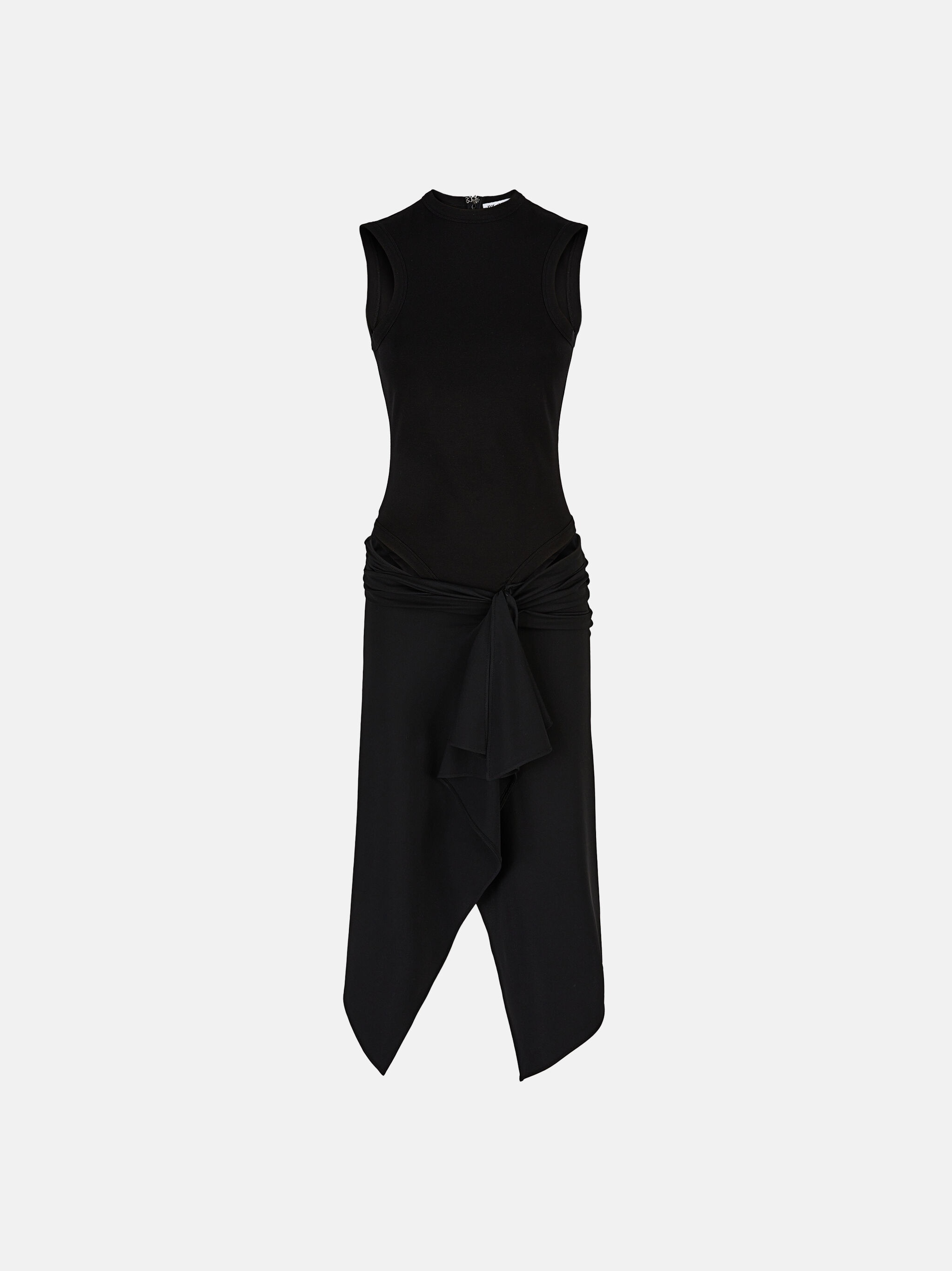 "Mirna" midi dress in black compact techno jersey with halter neckline body, handkerchief skirt and logo metal hook. Style 237WCM74RY02100 SIZE & FIT Regular fit. We recommend taking your true size. DETAILS Main fabric: 68% rayon 27% polyamide 5% elastane, lining: 75% acetate 20% polyamide 5% other fibres