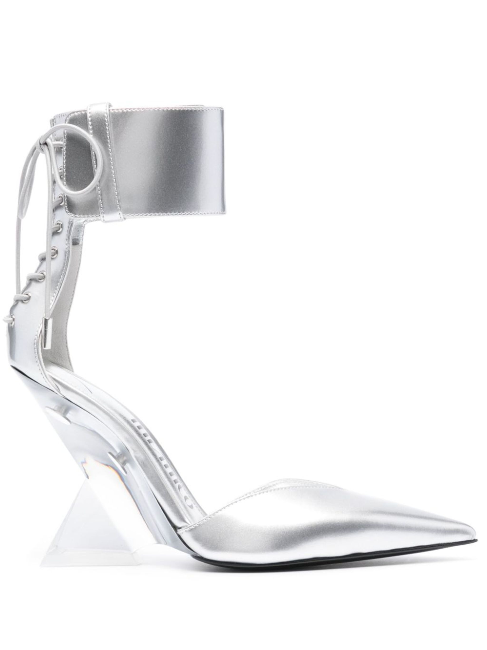 silver-tone calf leather metallic finish pointed toe branded footbed anklet detail 105mm high plexy pyramyd wedge heel leather outsole rear lace-up fastening ankle touch-strap fastening Size & Fit Model Measurements: Bust: 0cm Height: 0cm Hips: 0cm Waist: 0cm CIRCUMFERENCE: 18cm HEEL: 10.5cm HEIGHT: 13.5cm Fabric and Care Designer Style ID: 242WS627E098 Designer Colour: 631 Composition: Sole: Rubber 100%; Outer: Fabric 100%; Lining: Calf leather 100%Made in None