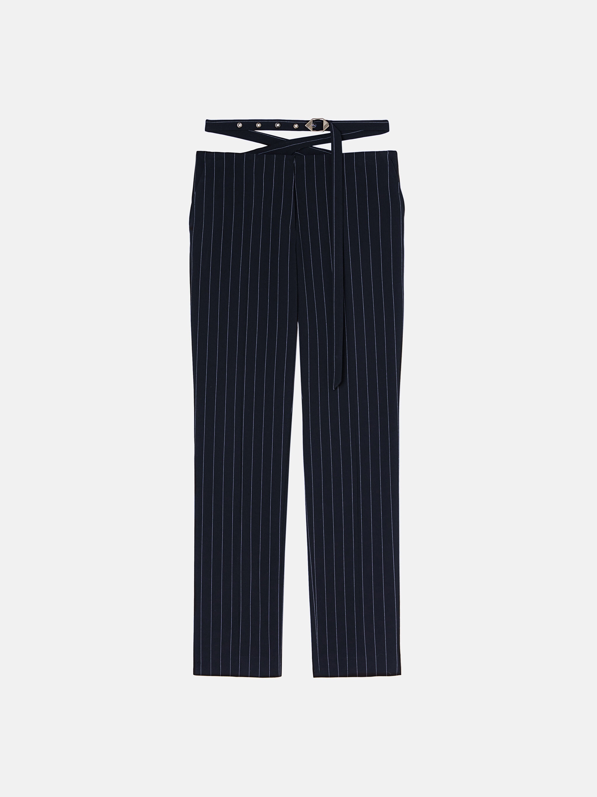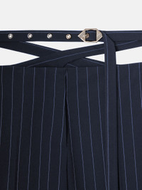 Long pants in navy blue and light blue wool pinstripe with cross on the back, frontal slash pockets and logo metal buckle. Made in Italy. Style 241WCP167E067596 SIZE & FIT The model is wearing a size 40 and her height is 69,6 in, bust 31,4 in, waist 23,6 cm, hips 34,6 in - height 177 cm, bust 80 cm, waist 60 cm, hips 88 cm. Regular fit. We recommend taking your true size. DETAILS Main fabric: 65% polyester 33% viscose 2% elastane, lining: 100% viscose