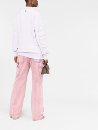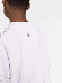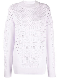 open-knit crew-neck jumper lilac purple cotton blend open knit ribbed knit silver-tone logo plaque crew neck long sleeves straight hem ribbed trim Made in Italy Composition Cotton 74%, Polyamide 26% SIZE & FIT Model measurements Height 5 ft 11 in(1.8 m) Bust/Chest 31.49 in(80 cm) Hips 36.61 in(93 cm) Waist 24.4 in(62 cm) FittingInformation This piece fits true to size. We recommend you get your regular size Cut for a loose fit Made with a mid-weight fabric Washing instructions Hand Wash