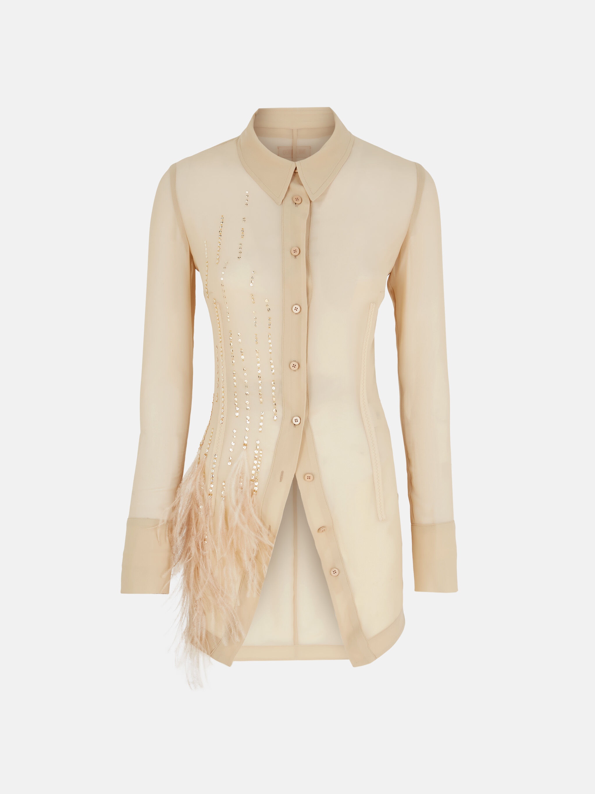Fitted shirt in pale pink embroidered georgette. Made in Italy. Style 250WCH00041PAA085RA701 SIZE & FIT The model is wearing a size 40 and her height is 69,6 in, bust 30,7 in, waist 23,2 in, hips 34,6 in - height 177 cm, bust 78 cm, waist 59 cm, hips 88 cm. Regular fit. We recommend taking your true size. DETAILS Main Material: 100% polyester, others: 45% Ostrich Feathers (Struthio Camelus Australis, coo: South Africa) 35% PVC 20% glass