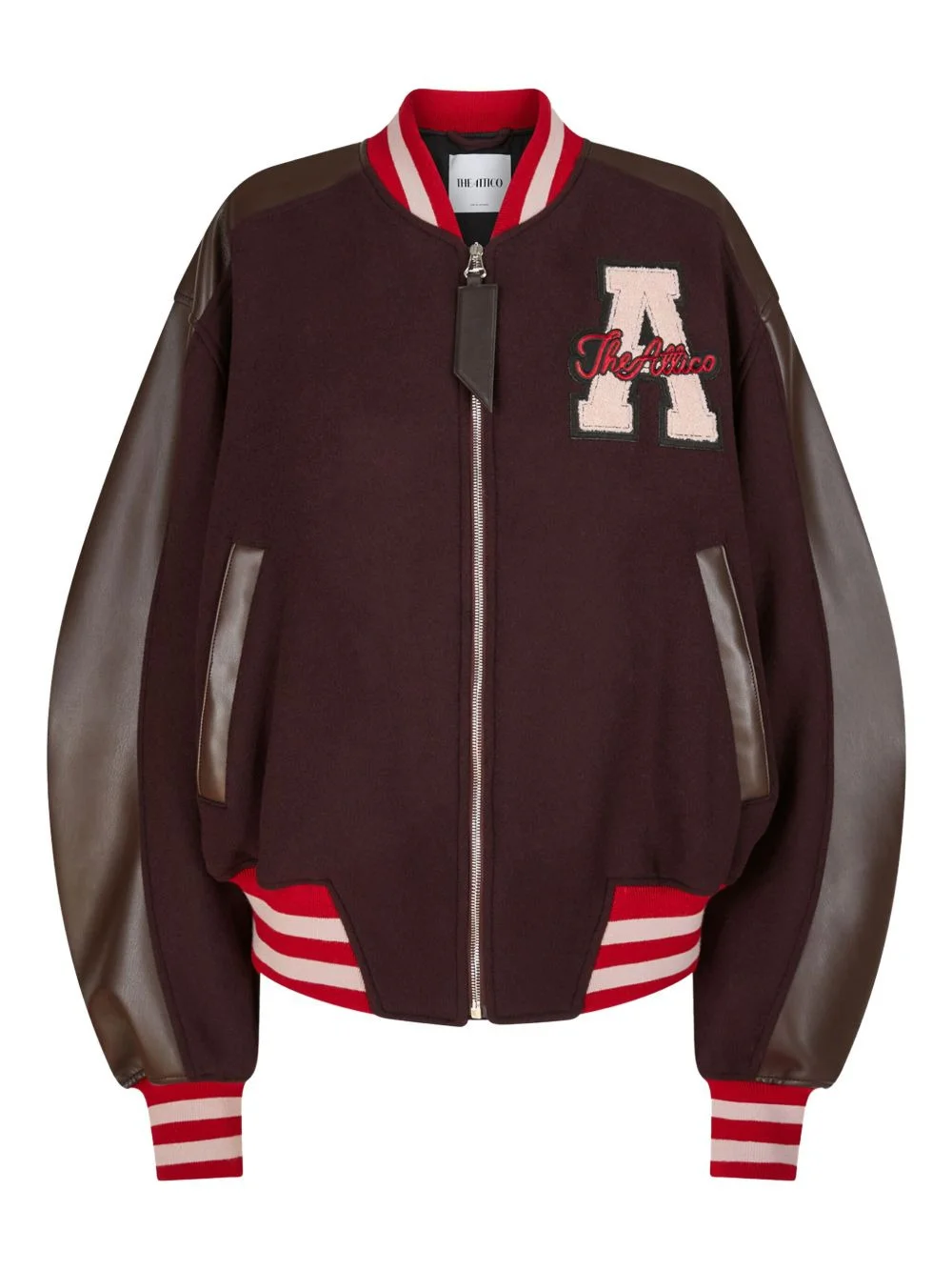 leather-sleeved logo-patch bomber jacket Highlights - Red-brown - Leather sleeves - Ribbed trims - Zip fastening - Logo patch - Wool body Made in Italy Composition Virgin Wool 75%, Polyamide 25% Washing instructions Read Manufacturer Guidelines