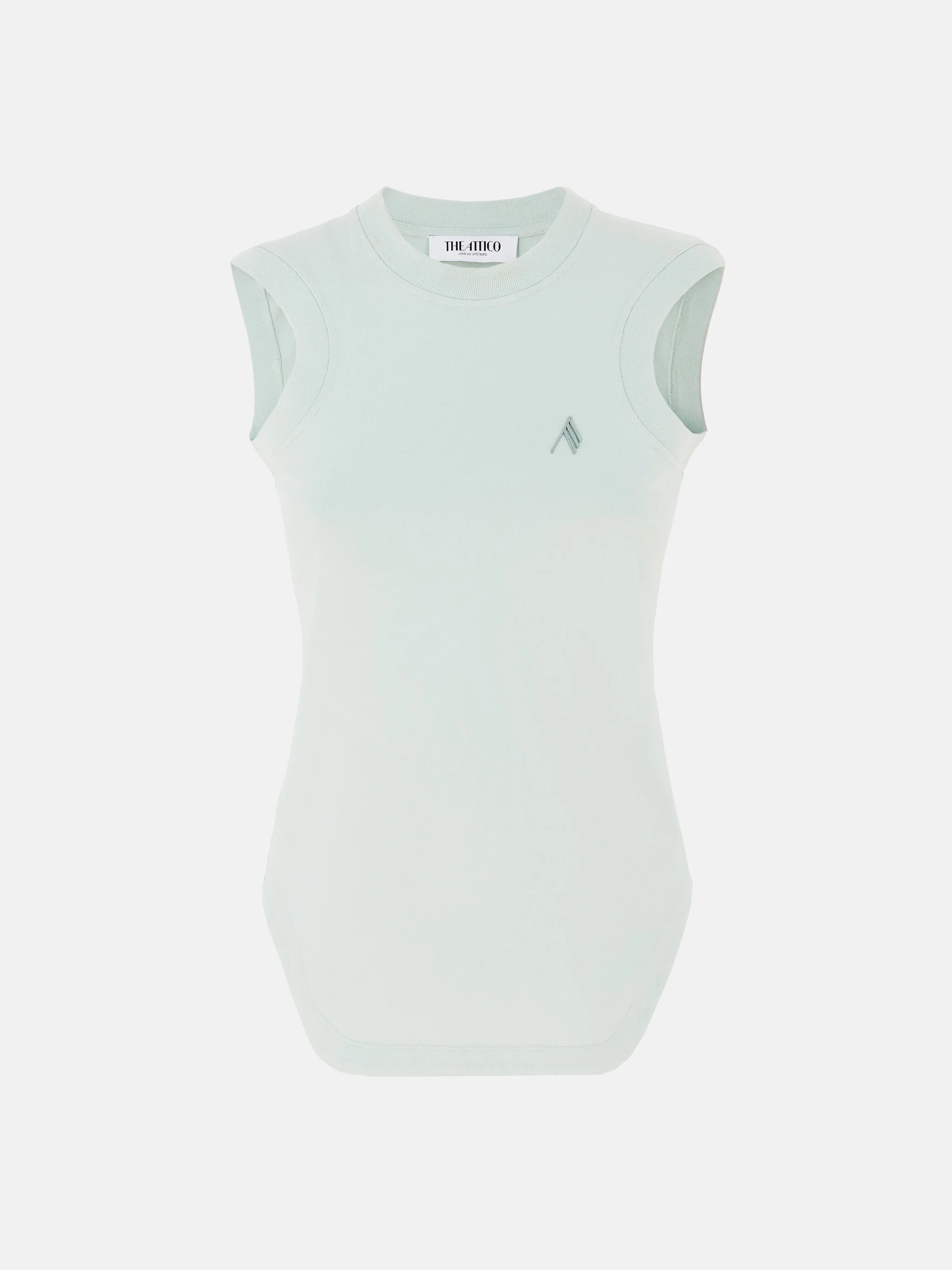 Reese'' armhole tank top in mint light jersey with shaped bottom and embroidered logo. Made in Italy. Style 250WCN00003JJJ025AA016 SIZE & FIT The model is wearing a size 40 and her height is 69,6 in, bust 30,7 in, waist 23,2 in, hips 34,6 in - height 177 cm, bust 78 cm, waist 59 cm, hips 88 cm. Regular fit. We recommend taking your true size. DETAILS Main Material: 100% cotton, rib: 100% cotton