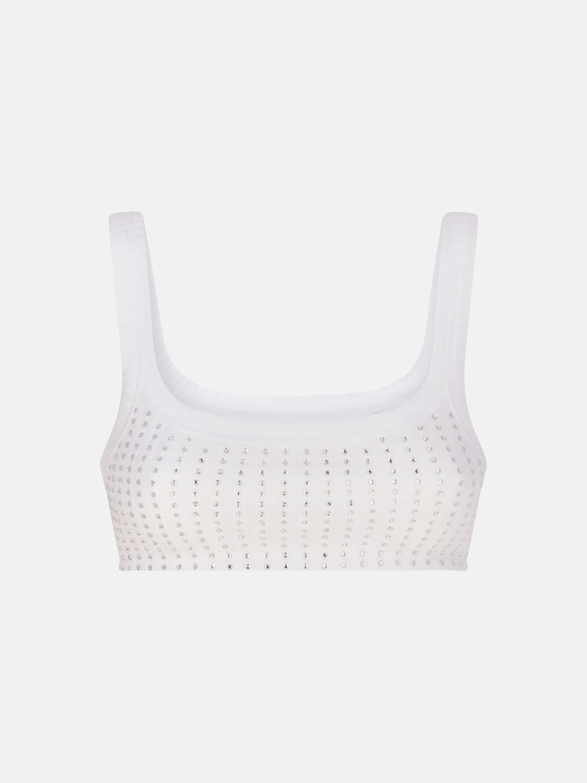 Top in white and crystal ribbed jersey full hotfix. Made in Italy. Style 247WCT275J050R480 SIZE & FIT The model is wearing a size 40 and her height is 69,6 in, bust 30,7 in, waist 23,2 in, hips 34,6 in - height 177 cm, bust 78 cm, waist 59 cm, hips 88 cm. Regular fit. We recommend taking your true size. DETAILS Main fabric: 100% cotton, strass: 100% glass