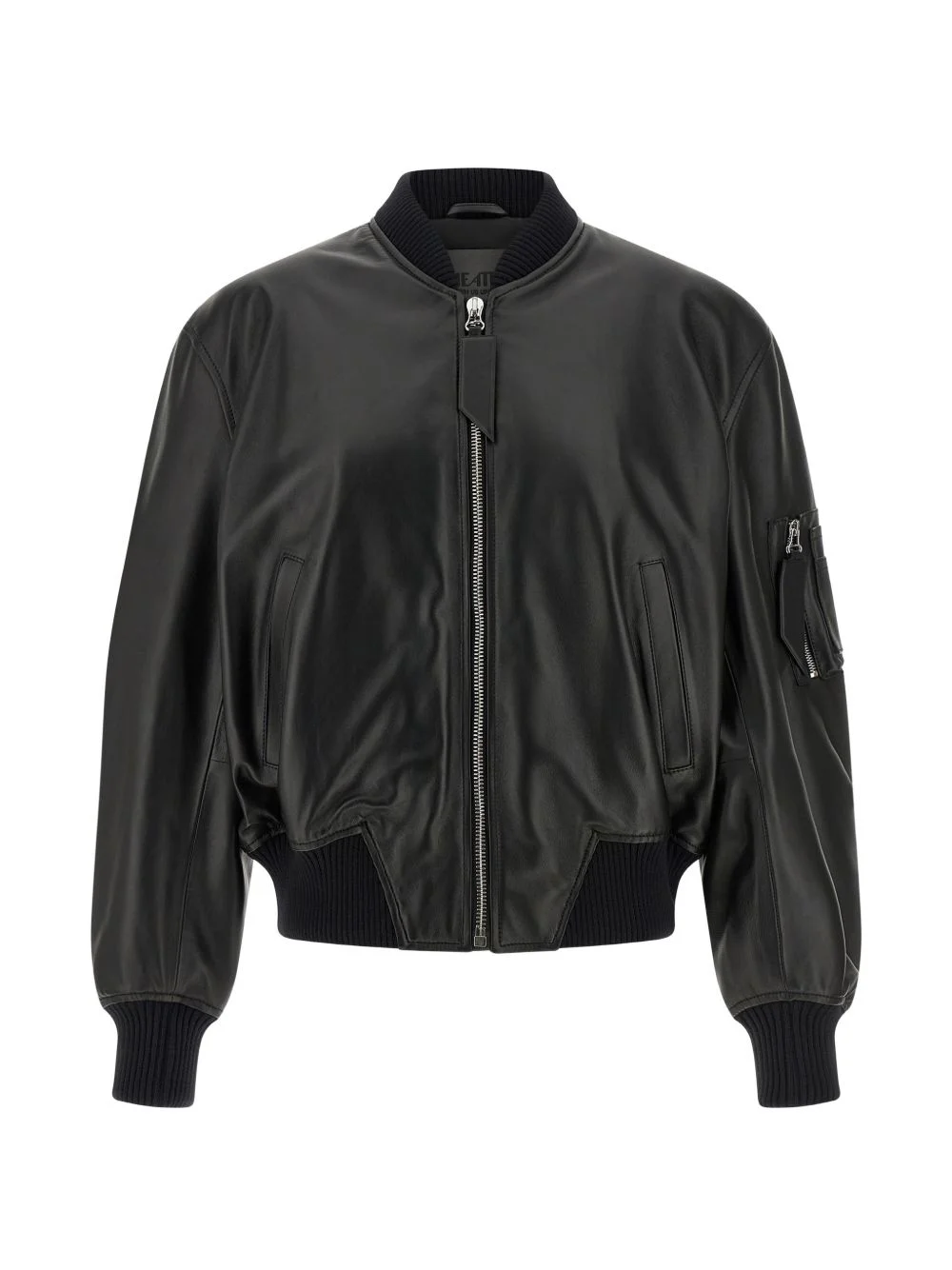 ribbed leather bomber jacket Highlights - Black - Ribbed knit details - High neck - Front zip closure - Side welt pockets - Long sleeves Imported Composition Lambskin 100% Washing instructions Specialist Cleaning