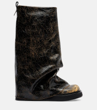 The Robin knee-high boots from The Attico are made from leather for a crinkled, worn-in effect. This statement pair features foldover uppers and rests atop sturdy soles. Product Details - Upper: leather - Lining: leather - Sole: leather insole and sole - Toe shape: round toe - Made in Italy - Includes: shoe box, dust bag - Designer color name: Brown Shades - Item color: brown, black - Hardware color: silver - Item number: P01128788 Size & Fit - True to size - For narrow feet, we recommend trying a half size smaller - European sizes - 4cm-1.5" heel (size EU 38) - 3cm-1" platform (size EU 38) - 34cm-13.5" shaft height (size EU 38) - 40cm-15.5" shaft width (size EU 38) - shaft width measured on largest part of boot