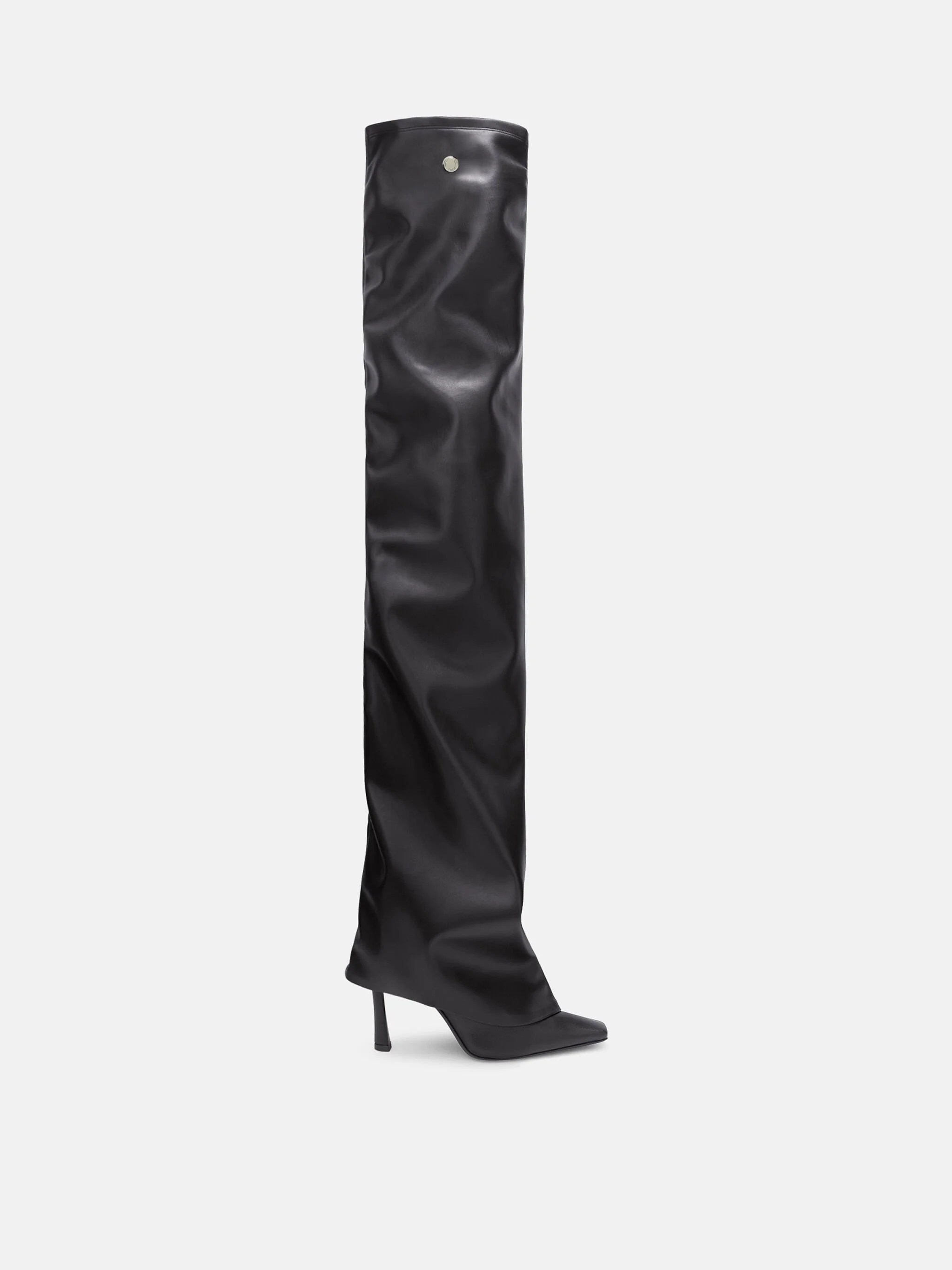 ''Robin OTK'' thigh high in black synthetic leather, heel height 99mm. Made in Italy. Style 250WSH00872PUR003AA100 SIZE & FIT Model wears size 39. DETAILS Main fabric: 55% polyurethane, 45% polyester, insole and lining: 100% goat leather dyed, capra hircus hircus farm raised coo: India, sole: 100% bovine leather dyed, bos taurus farm raised coo: Western Europe, heel 95mm.