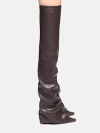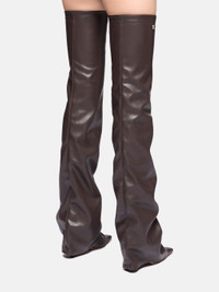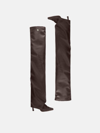 ''Robin OTK'' thigh high 95mm in brown synthetic leather. Made in Italy. Style 251WSH00872PUR003AA064 SIZE & FIT Model wears size 39 DETAILS Main fabric: 55% polyurethane, 45% polyester, insole and lining: 100% goat leather dyed, capra hircus hircus farm raised coo: India, sole: 100% bovine leather dyed, bos taurus farm raised coo: Western Europe, heel 95mm.