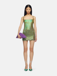 'Rue'' mini dress in iridescent green rectangular sequins with deep back neckline and logo metal hook. Made in Italy. Style 236WCA196H111527 SIZE & FIT The model is wearing a size 40 and her height is 70,4 in, bust 30,7 in, waist 21,6 in, hips 34,6 in - height 179 cm, bust 80 cm, waist 60 cm, hips 90 cm. Fitted style. We recommend taking one size larger. DETAILS Main fabric: 68% rayon, 27% nylon, 5% elastane, lining: 95% polyester, 5% elastane, embroidery: 80% polyvinyl chloride, 20% glass