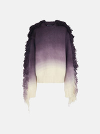 "Rundie" oversize sweater in purple multishades degradè stockinette stitch with fringes on sleeves and collar. Style 238WCK88KW041582 SIZE & FIT The model is wearing a size 40 and her height is 179 cm, bust 78 cm, waist 55 cm, hips 88 cm. Regular fit. We recommend taking your true size. DETAILS Main knit: 100% virgin wool