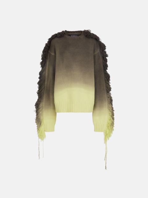 "Rundie" oversize sweater in purple multishades degrade stockinette stitch with fringes on sleeves and collar. Style 238WCK88KW041582 SIZE & FIT The model is wearing a size 40 and her height is 179 cm, bust 78 cm, waist 55 cm, hips 88 cm. Regular fit. We recommend taking your true size. DETAILS Main knit: 100% virgin wool