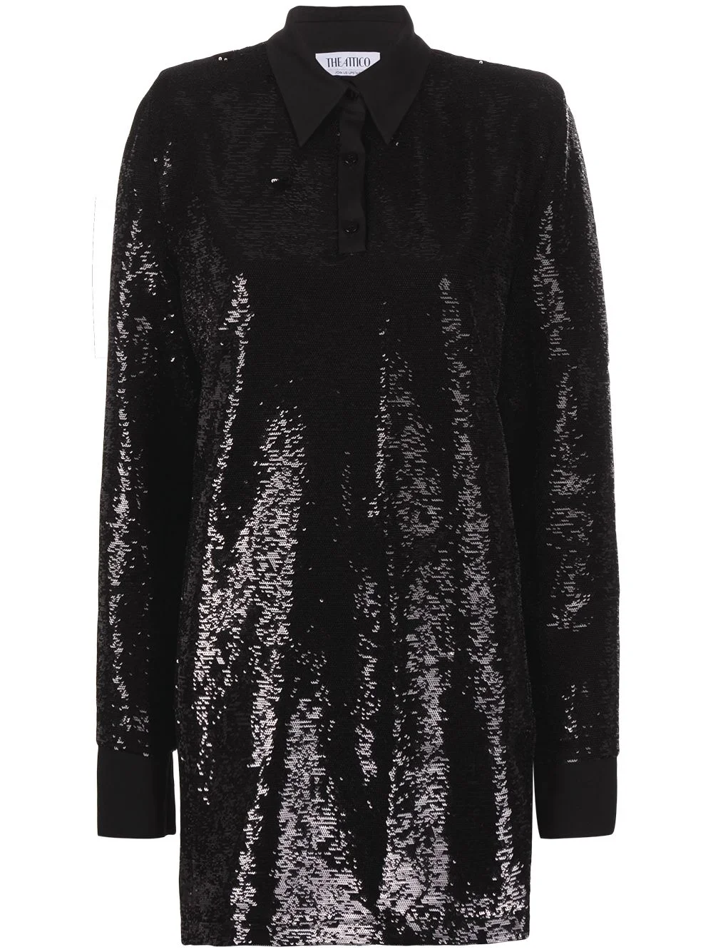 sequin-embellished mini dress black high-shine finish sequin embellishment long sleeves round neck Made in Italy Composition Outer: Cotton 100%, Polyester 100%, Polyethylene 100%, Viscose 95%, Spandex/Elastane 5% Lining: Polyester 100% SIZE & FIT Model measurements Height 5 ft 10 in(1.78 m) Bust/Chest 32.28 in(82 cm) Hips 35.03 in(89 cm) Waist 23.22 in(59 cm) Measurement SLEEVE LENGTH 17.71 in(45 cm) Shoulder Width 14.96 in(38 cm) LENGTH 30.31 in(77 cm) WAIST 37.79 in(96 cm) BUST 37 in(94 cm) FittingInformation This piece fits true to size. We recommend you get your regular size Cut for a loose fit Made with a mid-weight fabric Washing instructions Dry Clean Only