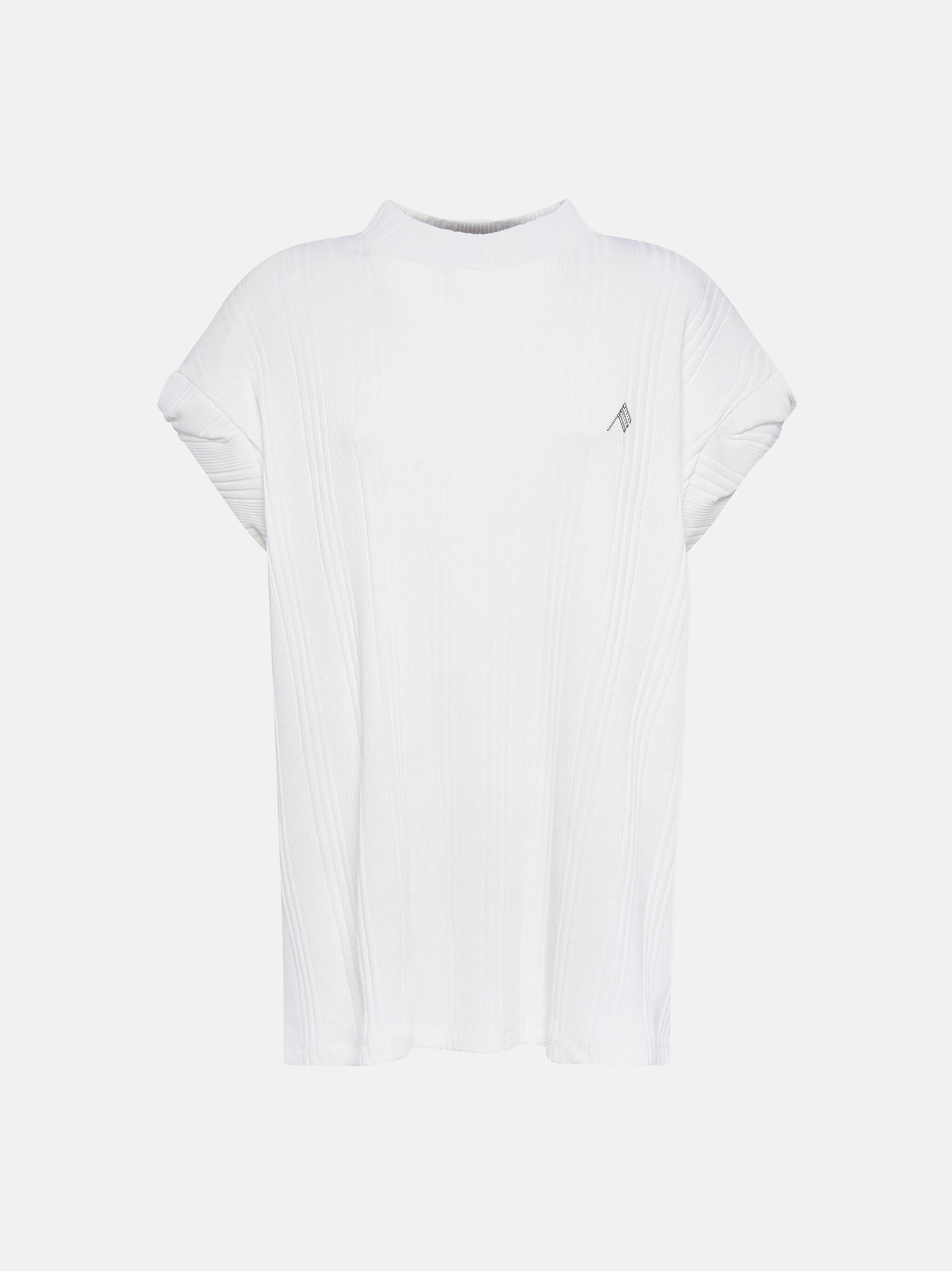 ''Laurie'' t-shirt in white flat ribbed jersey with shoulder pads, maxi torchons on the sleeves and patch logo. Made in Portugal. Style 247WCT182J048001 SIZE & FIT The model is wearing a size 40 and her height is 69,6 in, bust 30,7 in, waist 23,2 in, hips 34,6 in - height 177 cm, bust 78 cm, waist 59 cm, hips 88 cm. Relaxed, oversized fit. We recommend taking one size smaller. DETAILS Main fabric: 100% cotton