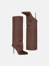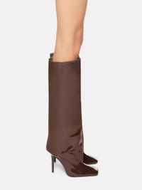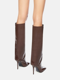 'Sienna'' tube boot in chocolate patent nappa leather with stiletto heel, height 105mm. Made in Italy. Style 241WS507L002590 SIZE & FIT Model wears size 39. DETAILS Main leather: 100% calf leather dyed, bos taurus farm raised coo: East Europe, insole and lining: 100% goat leather dyed, capra hircus farm raised coo: India, sole: 100% bovine leather dyed, bos taurus farm raised coo: Western Europe, heel 105mm.