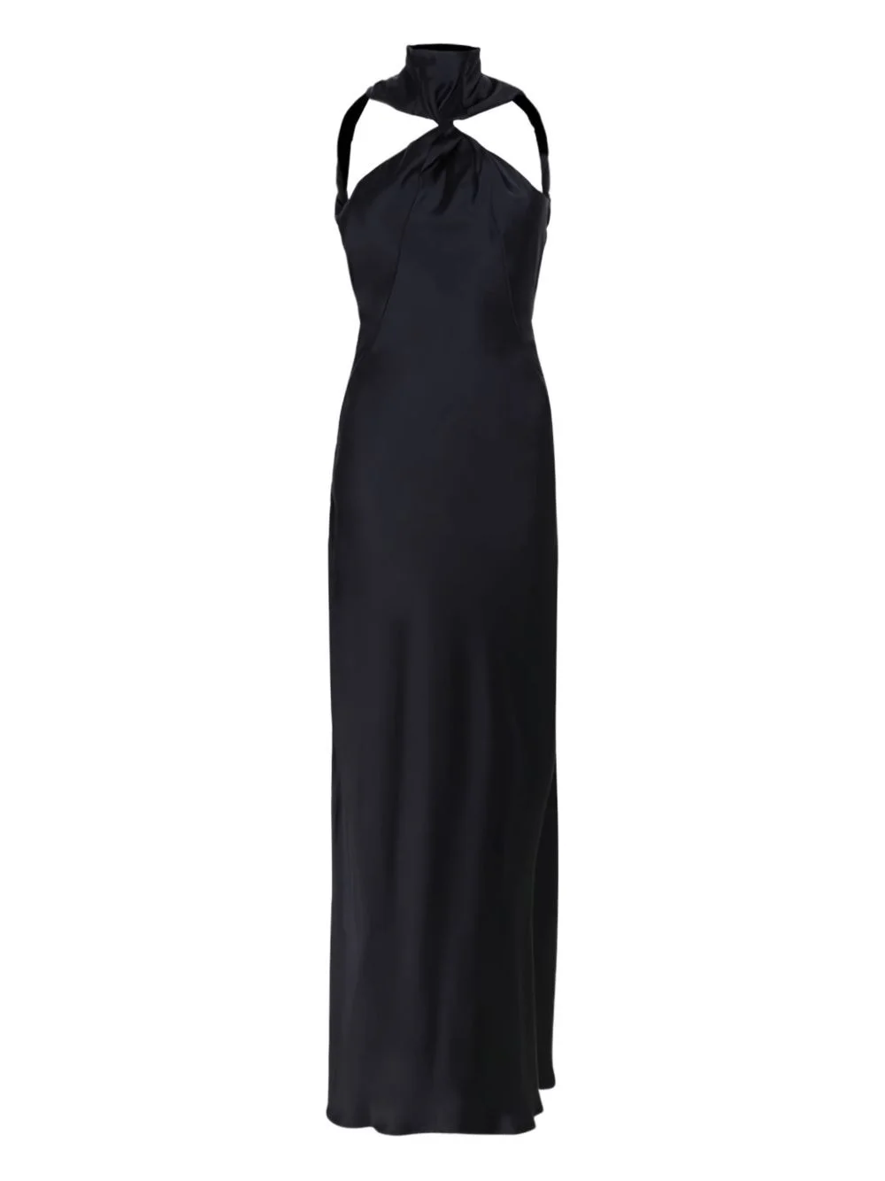 high-neck twisted maxi dress Highlights - Black - High neck - Twisted neckline detail - Cut-out shoulders - Open back Imported Composition Satin 100% Washing instructions Read Manufacturer Guidelines