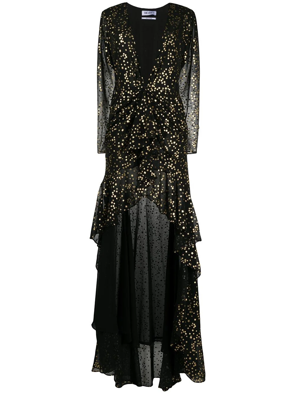 star-print plunge-neck dress Highlights - Black/gold - Sheer panelling - Space print - Ruffled detailing - knot detailing - plunging v-neck - long sleeves - high-low hem Made in Italy Composition Polyester 100% SIZE & FIT Model measurements Height 5 ft 10 in(1.78 m) Bust/Chest 31.49 in(80 cm) Hips 36.22 in(92 cm) Waist 25.59 in(65 cm) FittingInformation This piece fits true to size. We recommend you get your regular size Designed for a close fit at the bust, waist and hips Made with a mid-weight non-stretch fabric Washing instructions Dry Clean Only