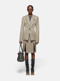Blazer in taupe gabardine with wide sleeve, jacquard logo lining and logo button. Made in Italy. Style 250WCG00061WWW046AA215 SIZE & FIT The model is wearing a size 40 and her height is 69,6 in, bust 30,7 in, waist 23,2 in, hips 34,6 in - height 177 cm, bust 78 cm, waist 59 cm, hips 88 cm. Regular fit. We recommend taking your true size. DETAILS Main Material: 100% virgin wool, lining: 100% viscose