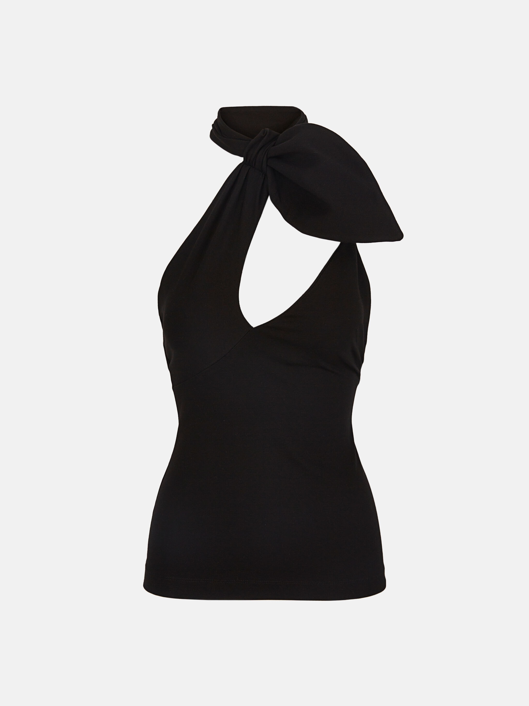''Tina'' asymmetrical top in black compact techno jersey with collar bow detail and logo metal ring. Style 237WCT203RY02100 SIZE & FIT Regular fit. We recommend taking your true size. DETAILS Main fabric: 68% rayon 27% polyamide 5% elastane
