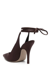 Venus 105mm slingback pumps Crafted in Italy from soft suede, this dark brown iteration of Attico's Venus pumps is defined by its sleek stiletto heel that adds a contemporary appeal to the silhouette. Fastening at the ankle with a tie-string, they channel the cult brand's bold approach to accessories. Highlights - Coffee brown - Suede - Tie-fastening ankle strap - Slingback strap - Pointed toe - Branded leather insole - High stiletto heel Composition Outer: Suede 100% Lining: Goat Skin 100% Sole: Bovine Leather (Top Grain) 100% SIZE & FIT Measurement HEEL 4.5 in(11.5 cm)