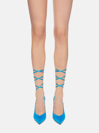 "Venus" blue slingback with ankle strap, heel height 105mm Style 211WS032V015014 SIZE & FIT Model wears size 39 DETAILS Main fabric:100% PES dyed- Insole and lining: 100% GOAT leather, dyed, capra hircus farm raised coo:india- Sole:100% BOVINE leather bos taurus dyed farm raised coo:france-Heel 105mm-Style 211WS032V015014
