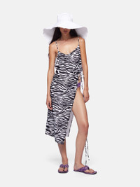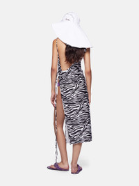 Midi dress in white and black zebra printed lycra with deep side slit, asymmetrical neckline and logo metal ends. Made in Italy. Style 243WCM93PA14020 SIZE & FIT The model is wearing a size 40 and her height is 5,10 in, bust 31,5 in, waist 23 in, hips 34,5 in - height is 176 cm, bust 79 cm, waist 58 cm, hips 87 cm. Regular fit. We recommend taking your true size. DETAILS Main fabric: 80% nylon 20% elastane, lining: 73% nylon 27% elastane