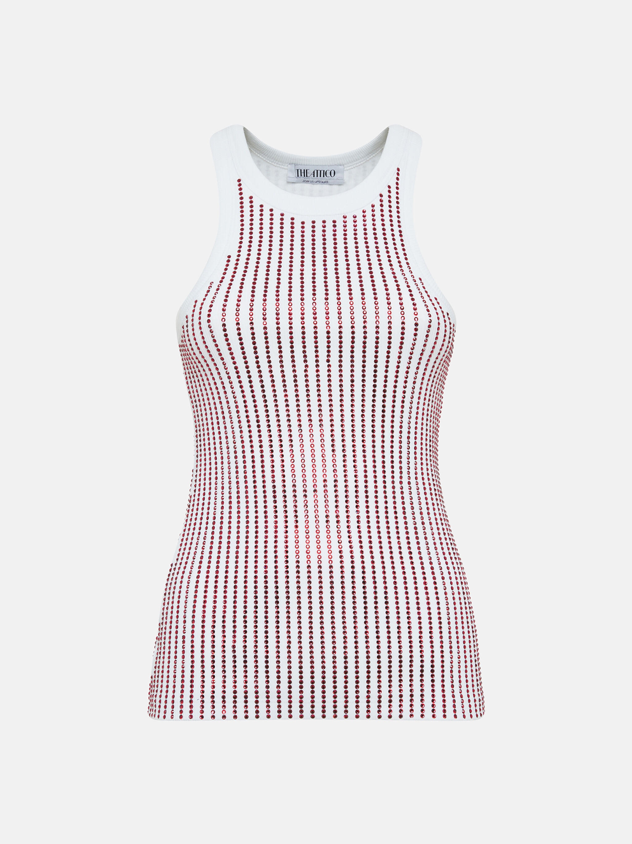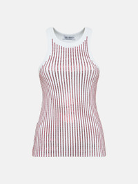 Top in white and red ribbed jersey stipes hotfix. Made in Italy. Style 247WCT276J050R059 SIZE & FIT The model is wearing a size 40 and her height is 69,6 in, bust 30,7 in, waist 23,2 in, hips 34,6 in - height 177 cm, bust 78 cm, waist 59 cm, hips 88 cm. Regular fit. We recommend taking your true size. DETAILS Main fabric: 100% cotton, strass: 100% glass