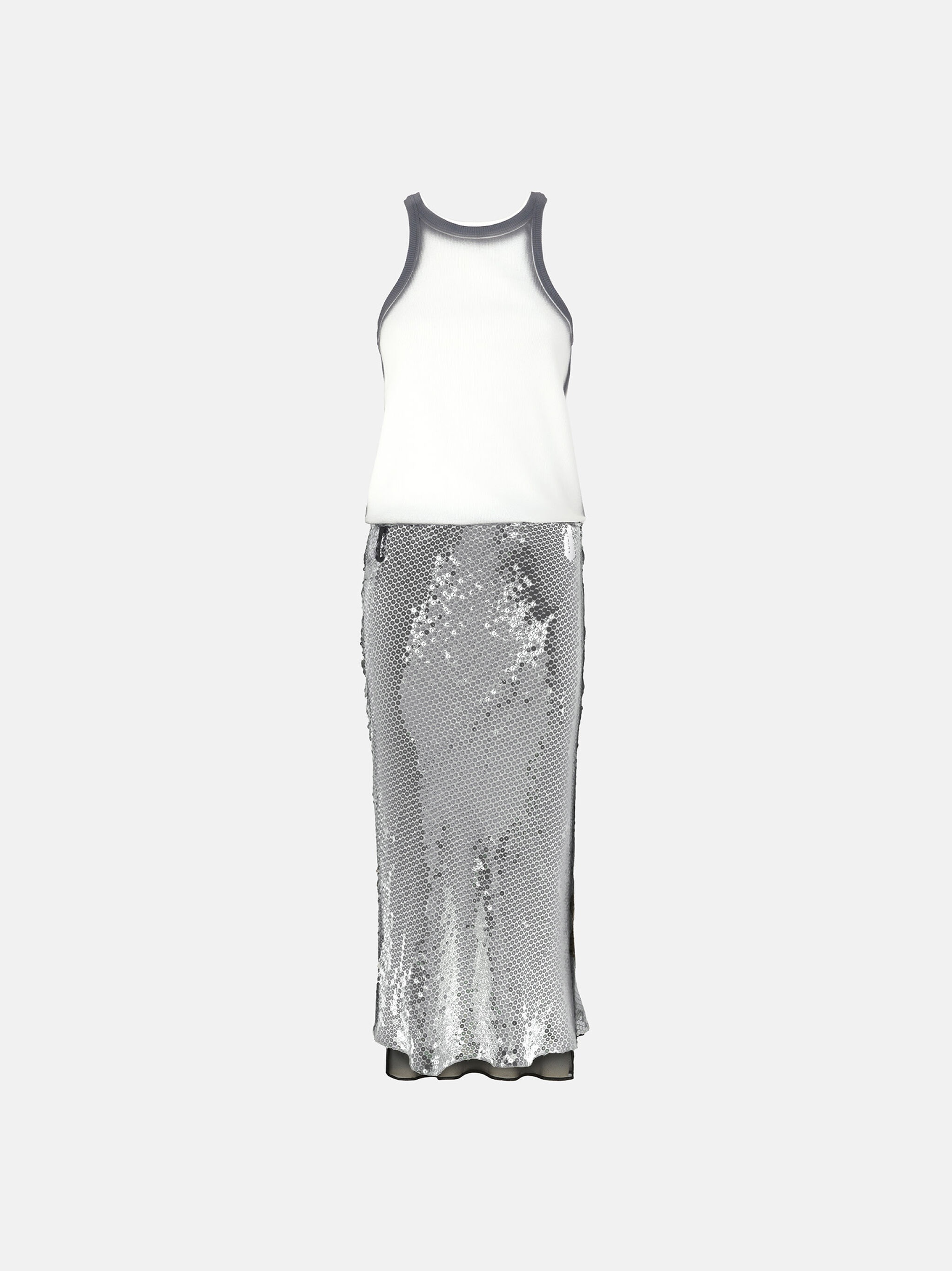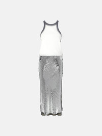 Combined midi dress in white and silver jersey rib and sequins. Made in Italy. Style 250WCW00180MIX014SP694 SIZE & FIT The model is wearing a size 40 and her height is 69,6 in, bust 30,7 in, waist 23,2 in, hips 34,6 in - height 177 cm, bust 78 cm, waist 59 cm, hips 88 cm. Regular fit. We recommend taking your true size. DETAILS Main Material: 95%CO 5%EA- Second Material: 100%PL- Lining: 100% PL