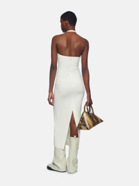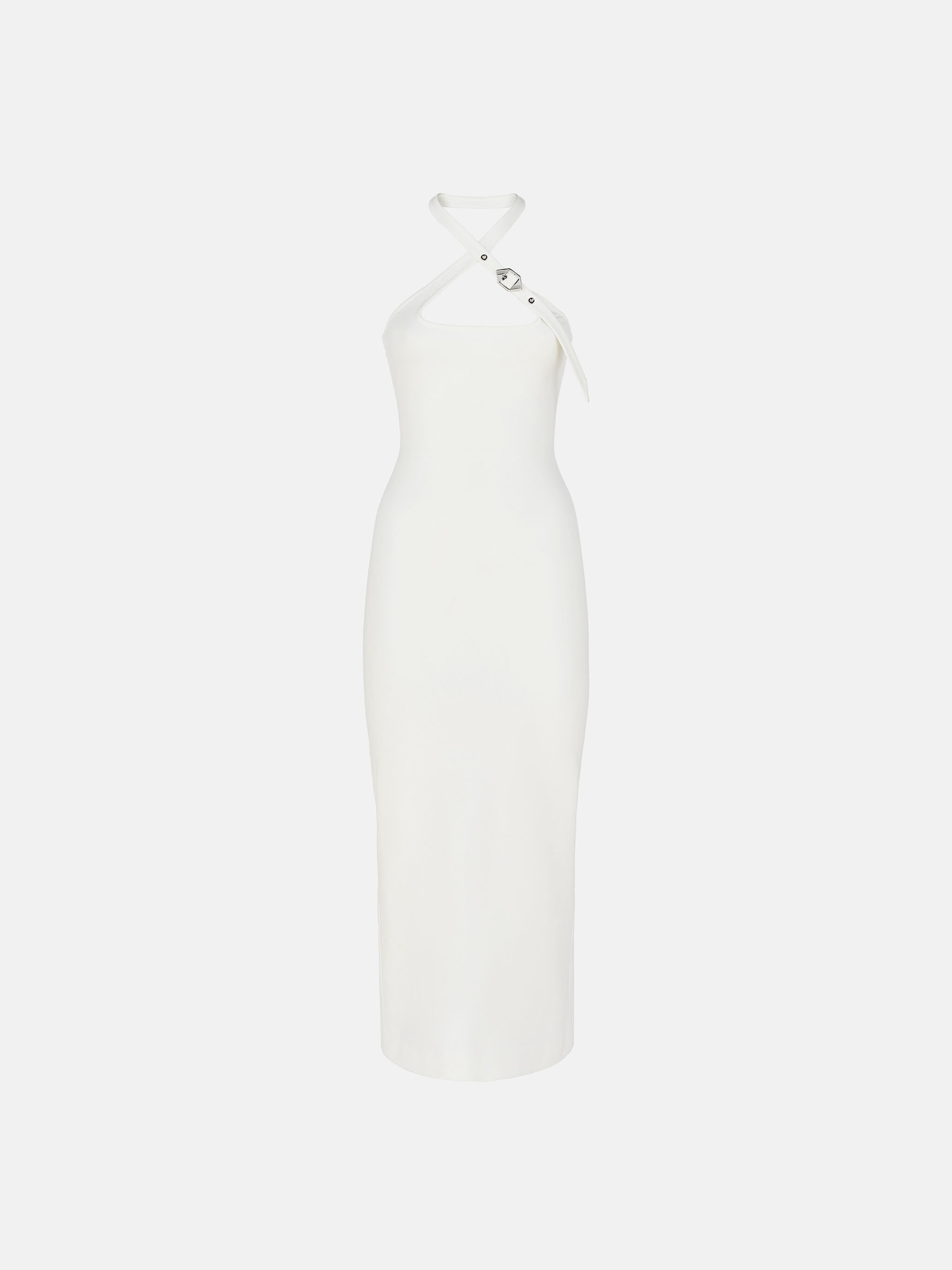 Midi dress in white compact techno jersey with halter neckline and logo metal buckle. Made in Italy. Style 241WCM102RY02001 SIZE & FIT The model is wearing a size 40 and her height is 69,6 in, bust 31,4 in, waist 23,6 cm, hips 34,6 in - height 177 cm, bust 80 cm, waist 60 cm, hips 88 cm. Regular fit. We recommend taking your true size. DETAILS Main fabric: 68% rayon 27% polyamide 5% spandex, second fabric: 100% polyester