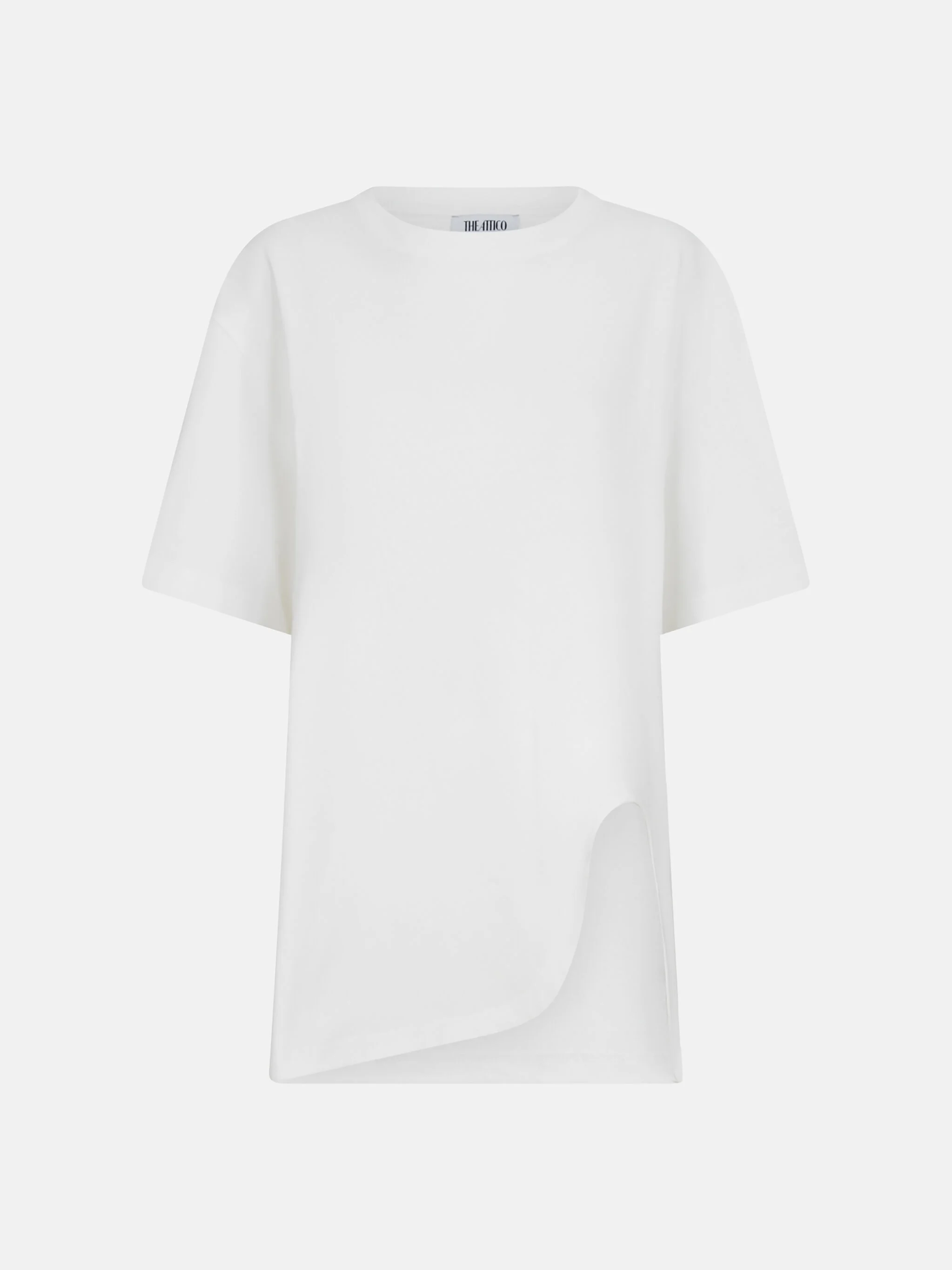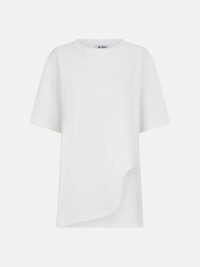 Oversize t shirt in white light jersey whirt with shaped split. Made in Italy. Style 250WCT00350JJJ025AA001 SIZE & FIT The model is wearing a size 40 and her height is 69,6 in, bust 30,7 in, waist 23,2 in, hips 34,6 in - height 177 cm, bust 78 cm, waist 59 cm, hips 88 cm. Regular fit. We recommend taking your true size. DETAILS Main Material: 100% cotton, rib: 100% cotton